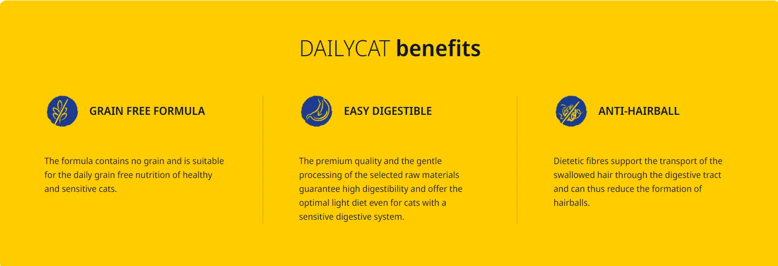 این فرمولاسیون کاملاً بدون غلات (Grain Free) است و از پروتئین مرغ باکیفیت برای تأمین انرژی و حفظ عضلات استفاده میکند. ترکیب متعادل پروتئین، چربی و فیبر، باعث میشود دیلی کت انتخابی ایدهآل برای گربههایی باشد که به غلات حساساند یا دچار مشکلات گوارشی خفیف هستند.
