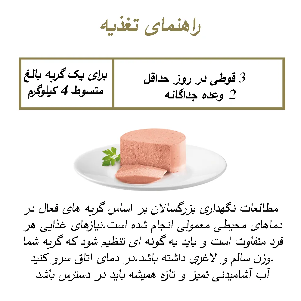 به گربه بالغ خود(4 کیلوگرم) 3 دوز در روز. حداقل به 2 وعده غذایی تقسیم  شده بدهید.این دستورالعمل ها بر اساس گربه های با فعالیت متوسط در دمای محیط معمولی است.
