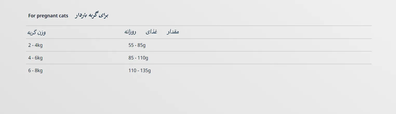 همچنین برای گربههای باردار ۲–۴ کیلوگرمی ۵۵–۸۵ گرم، ۴–۶ کیلوگرمی ۸۵–۱۱۰ گرم و ۶–۸ کیلوگرمی ۱۱۰–۱۳۵ گرم در روز توصیه شده است.