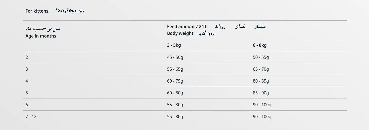 برای گربههایی با وزن نهایی ۶–۸ کیلوگرم این مقادیر کمی بالاتر است.