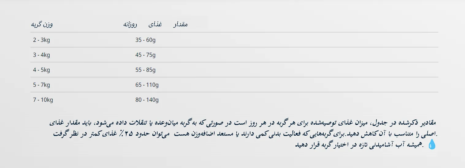 این جدول میزان غذا را بر اساس وزن حیوان مشخص میکند. اگر گربه کمتر فعالیت داشته باشد یا میانوعده دریافت کند، این مقدار باید کاهش یابد
