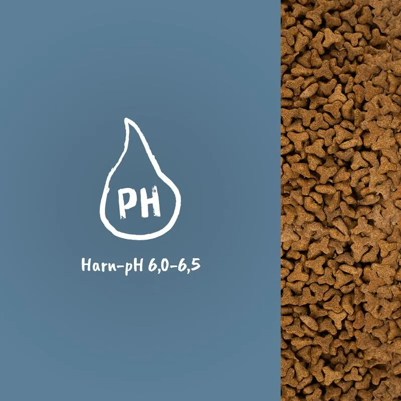 انتخاب دقیق مواد اولیه و نسبت بهینه کلسیم و فسفر همراه با کاهش منیزیم، به حفظ pH ادرار در محدوده ۶٫۰ تا ۶٫۵ کمک میکند. این ویژگی خطر تشکیل سنگهای ادراری را کاهش داده و به سلامت دستگاه ادراری گربه کمک میکند.