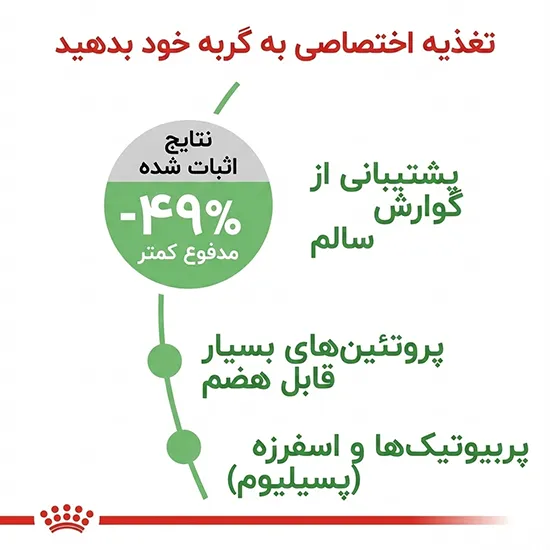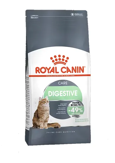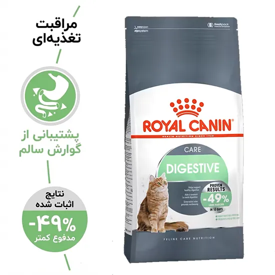 اگر گربهتان معده حساسی دارد، مدفوع زیاد تولید میکند، یا از مشکلات گوارشی مثل برگشت غذا و هضم سخت رنج میبرد، Royal Canin Digestive Care یک گزینه ایدهآل، علمی و بسیار مؤثر است. این غذا با ترکیبی از پروتئینهای بسیار قابلهضم، فیبرهای تنظیمکننده روده و پریبیوتیکها، به هضم بهتر، مدفوع کمتر و سلامت گوارشی پایدار کمک میکند.