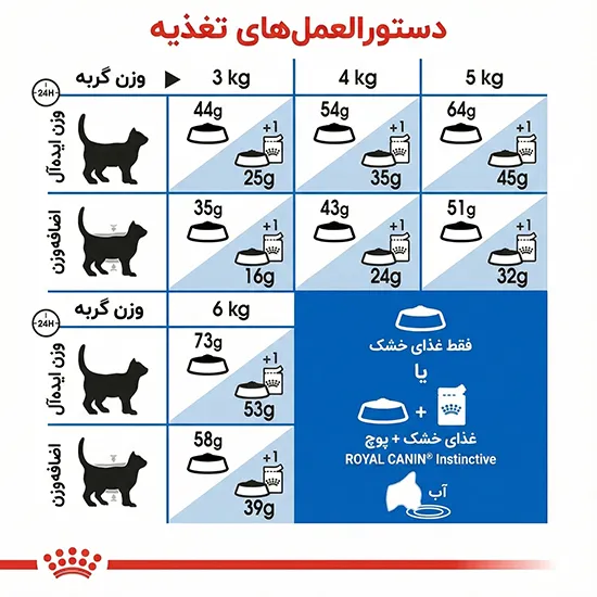 ترکیب غذای خشک با غذای مرطوب Royal Canin Instinctive نیز امکانپذیر است تا هم مواد مغذی و هم هیدراتاسیون گربه بهینه شود.